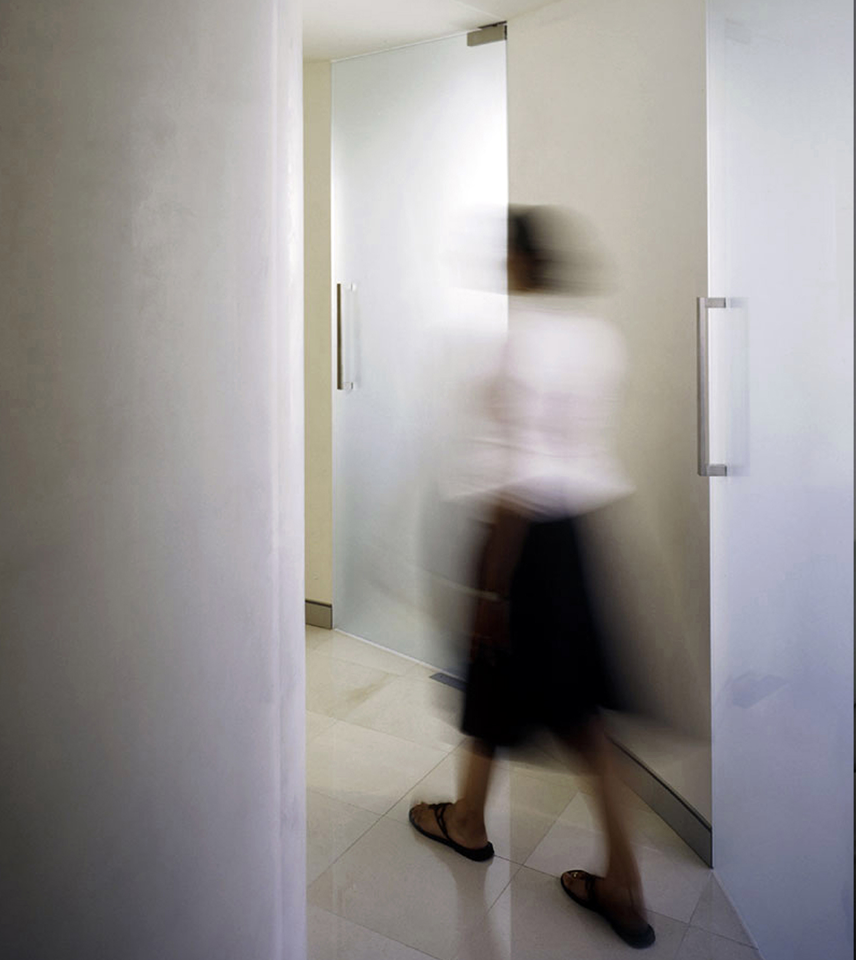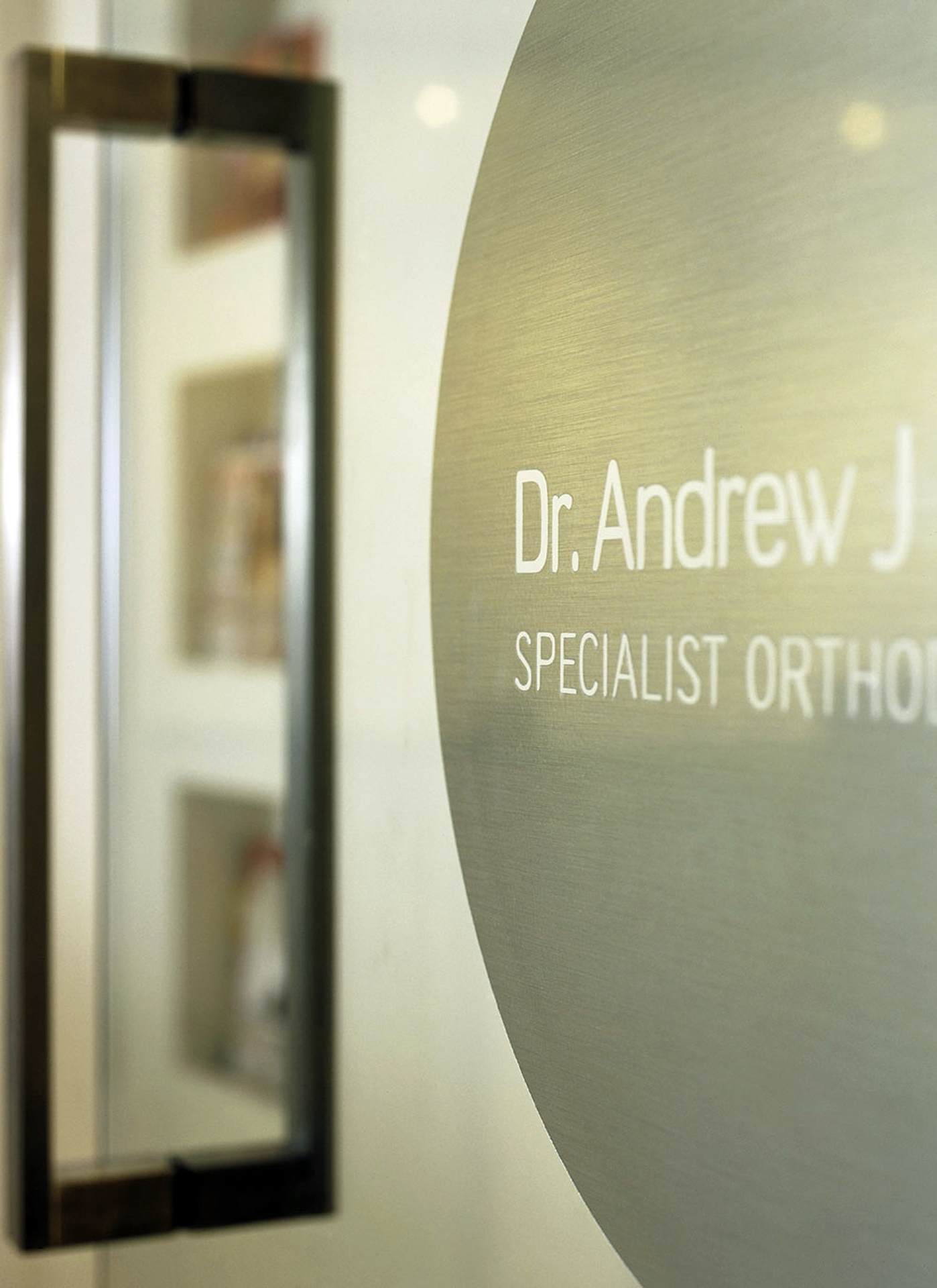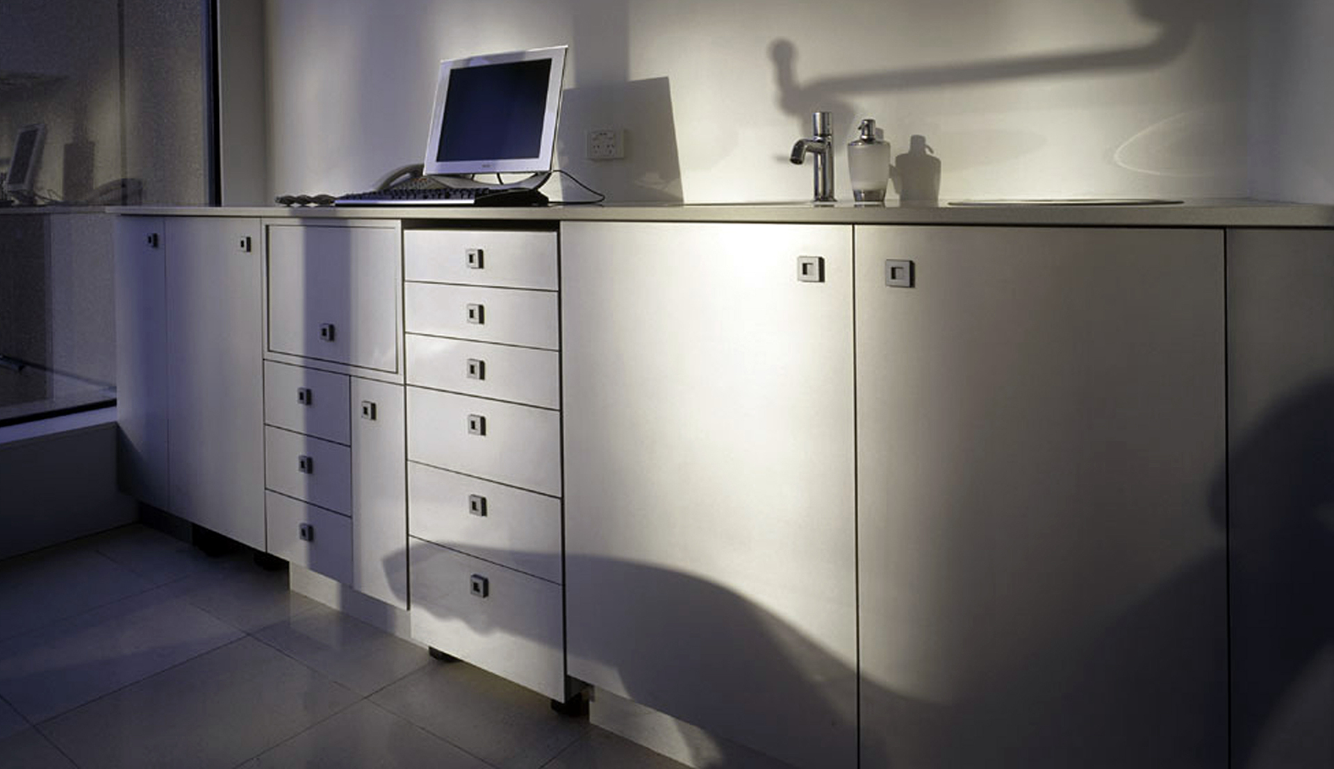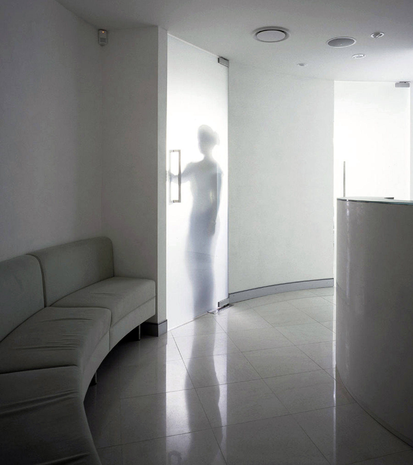 The alabaster white polished stucco to the circular wall & reception counter, frameless glass doors to the surgeries and anodised aluminium laminated joinery lend a futuristic element to the pristine space,